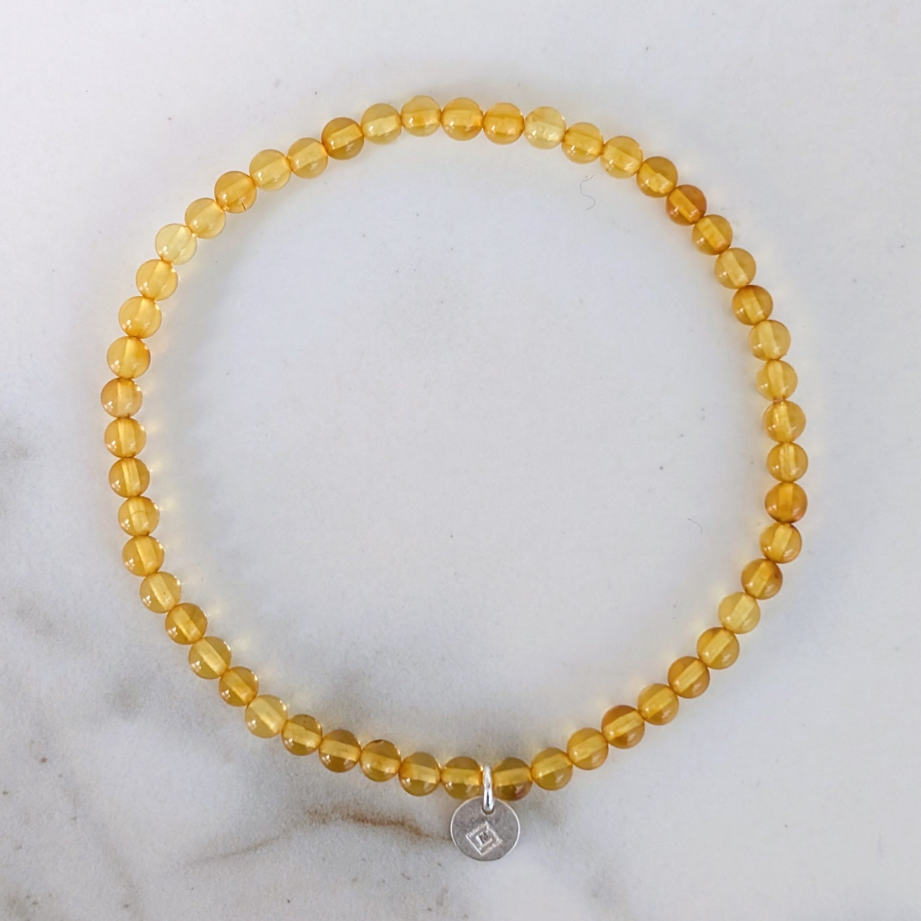 Double-strung elasticated natural Baltic Amber 4mm smooth bead bracelets with our sterling silver 925 Lapis London logo disc.