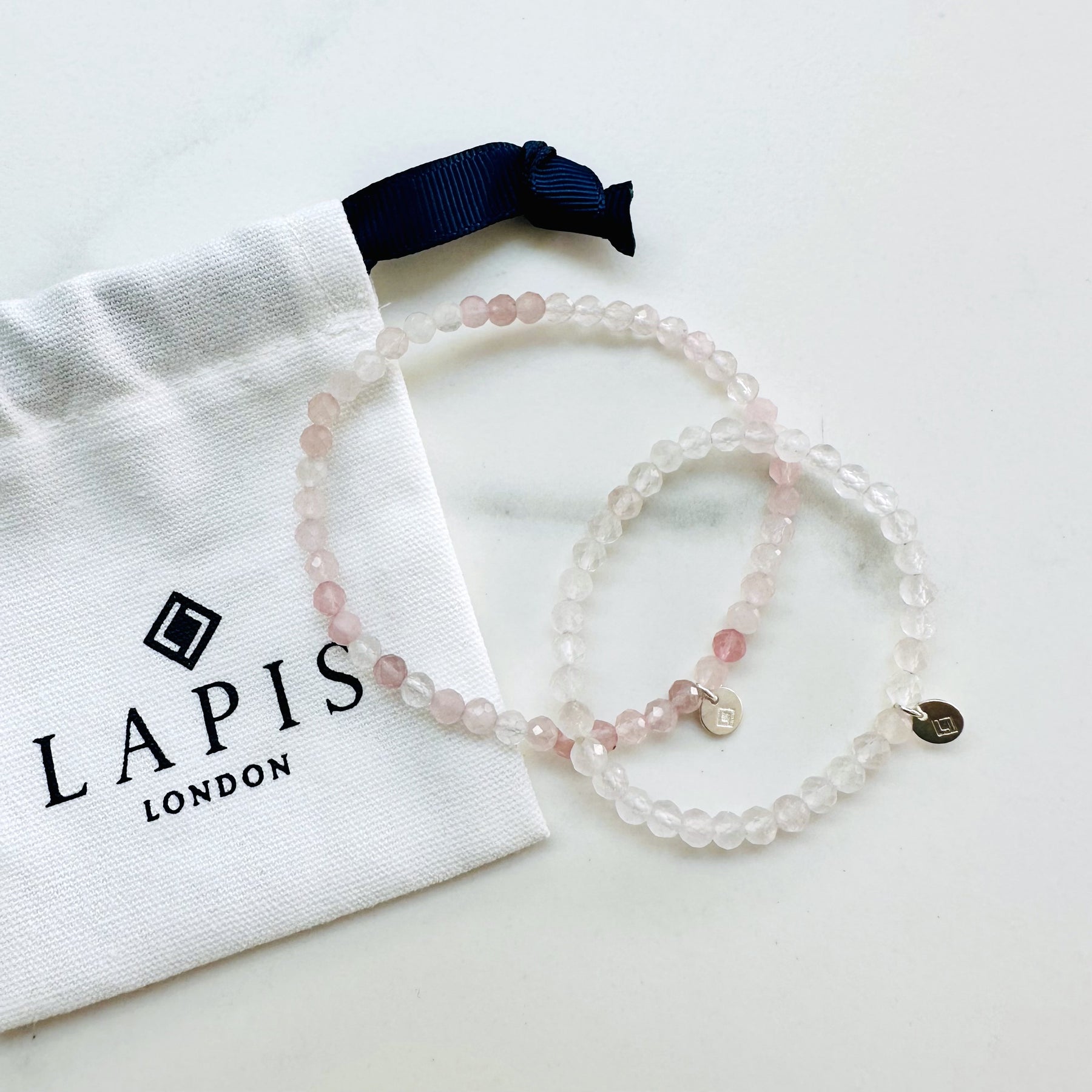 Beautiful dainty double-strung elasticated natural gemstone 4mm faceted bead bracelets with our sterling silver 925 Lapis London logo disc.