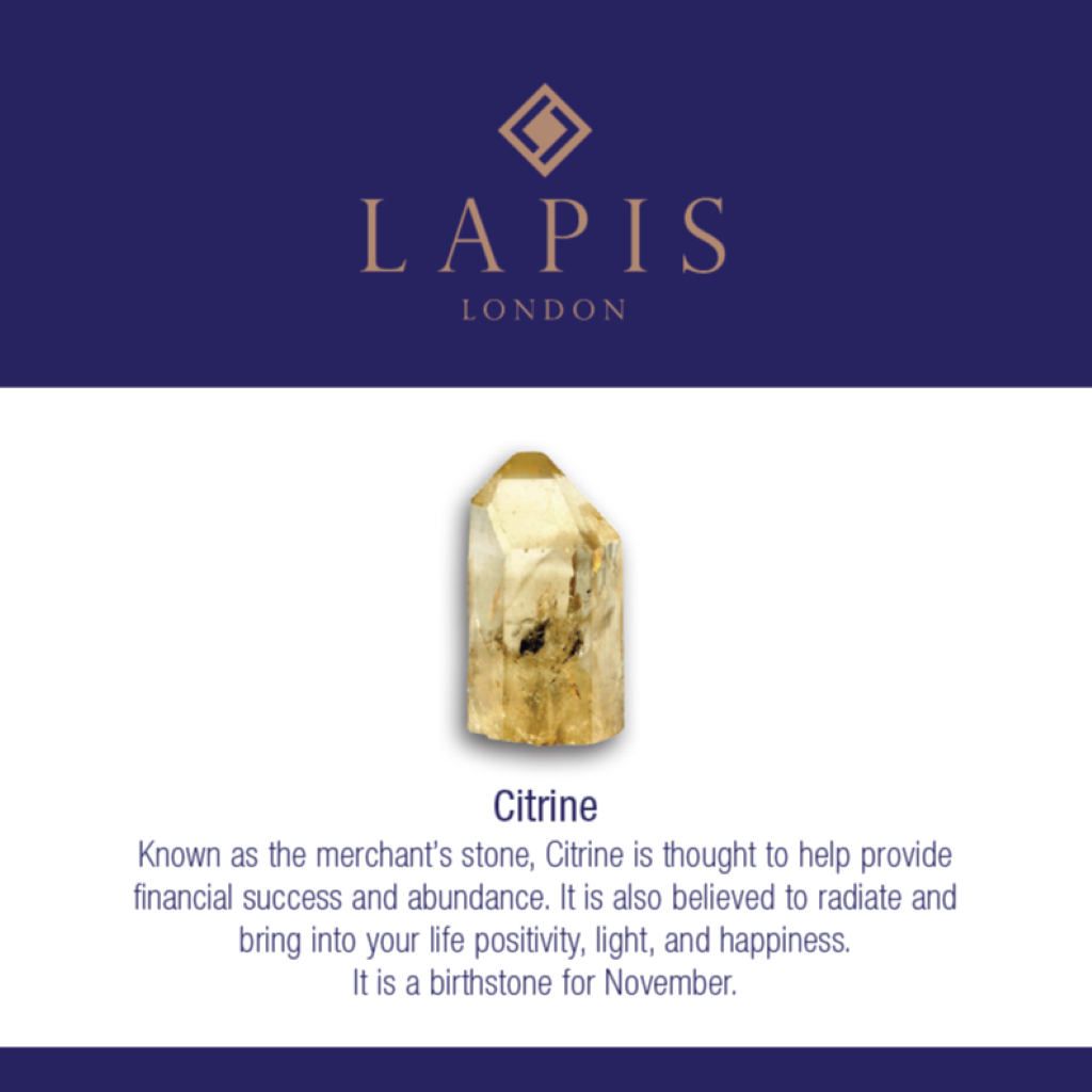 Known as the merchant’s stone, Citrine is thought to help provide financial success and abundance. It is also believed to radiate and bring into your life positivity, light, and happiness.