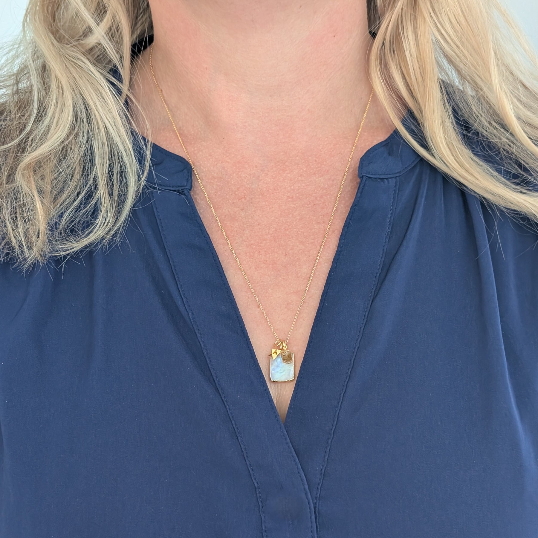 A beautiful 18 carat gold plated Moonstone rectangular slice pendant and Citrine rough tumblestone, teamed with a beautiful 18 carat gold plated tetrahedron charm.