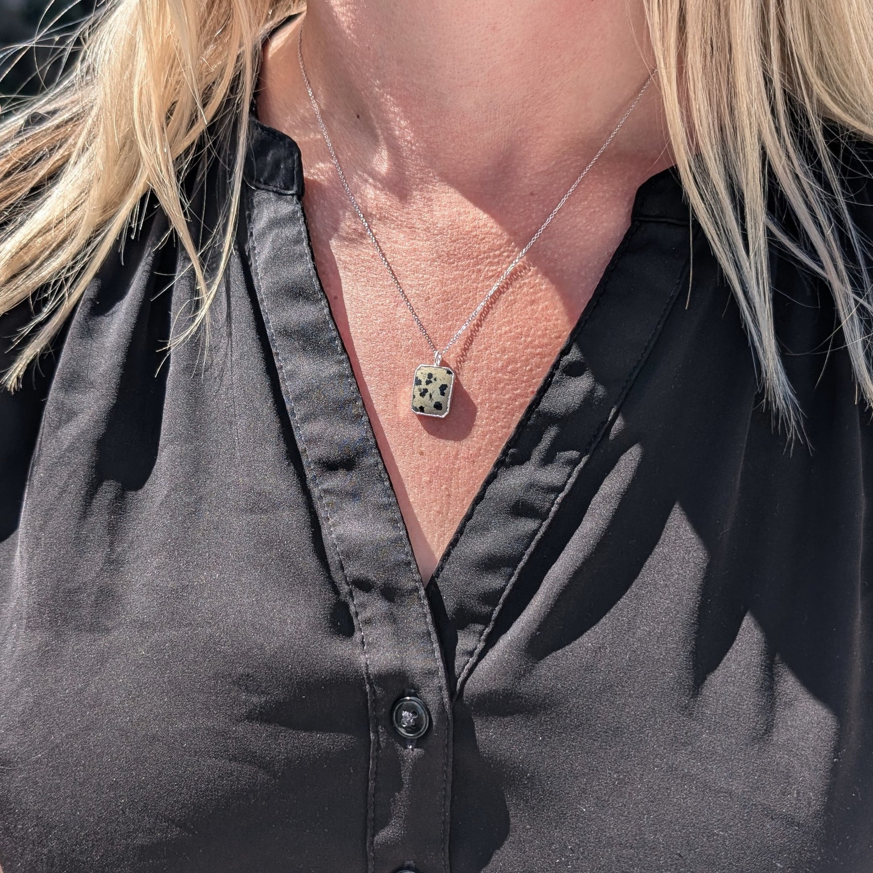 A beautiful sterling silver Dalmatian Jasper rectangular slice pendant suspended on a charm of your choosing.