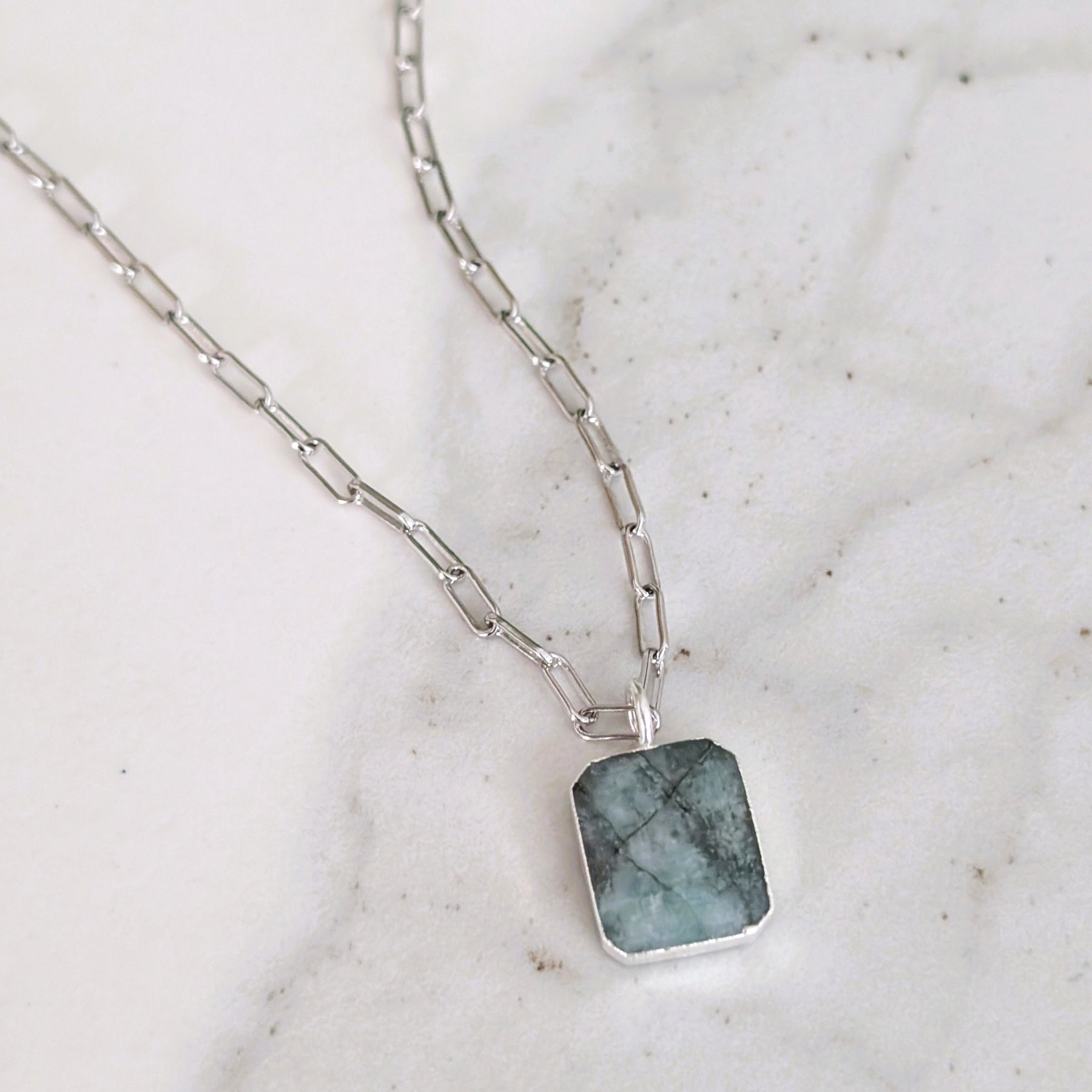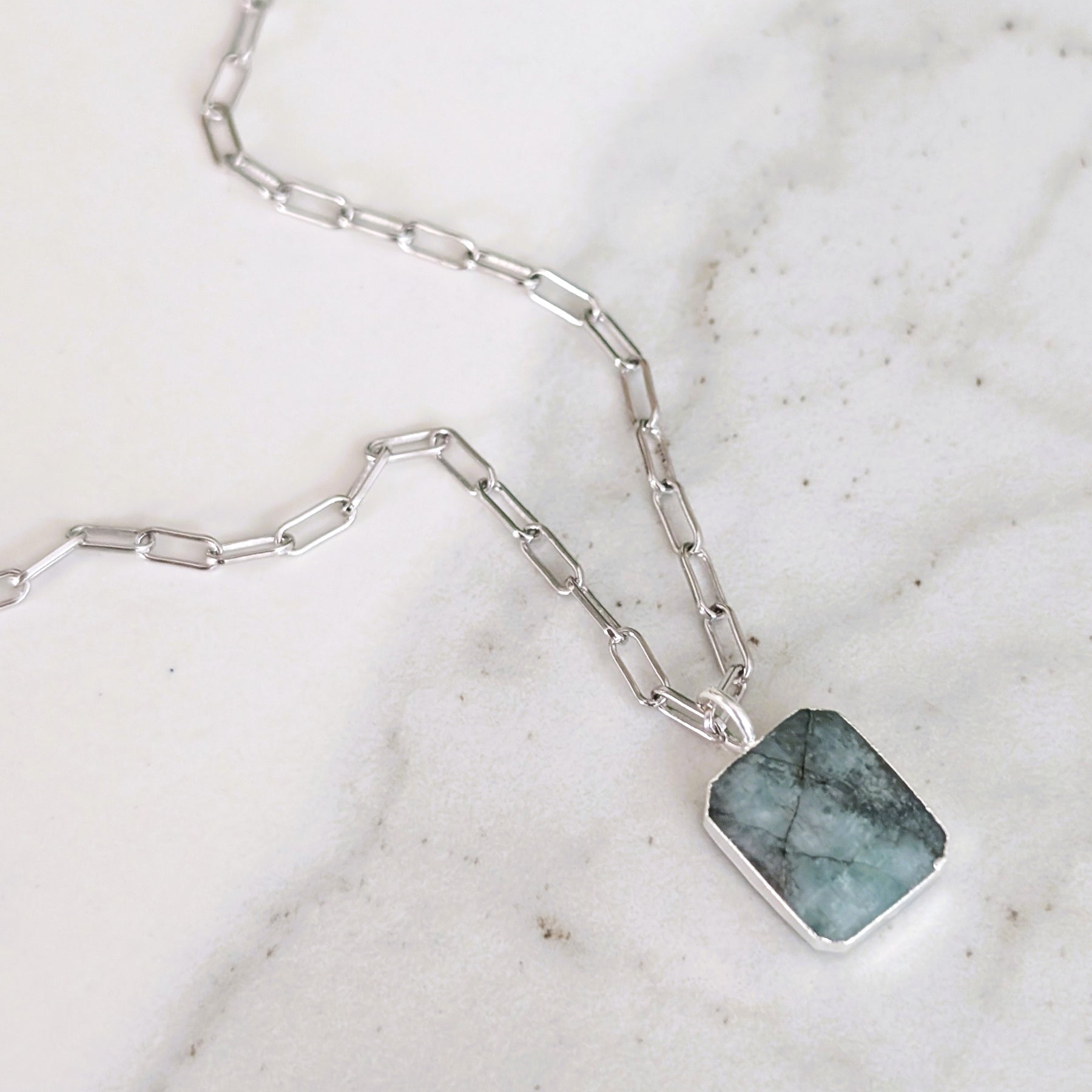 A beautiful sterling silver Emerald rectangular slice pendant suspended on a sterling silver chain of your choosing.