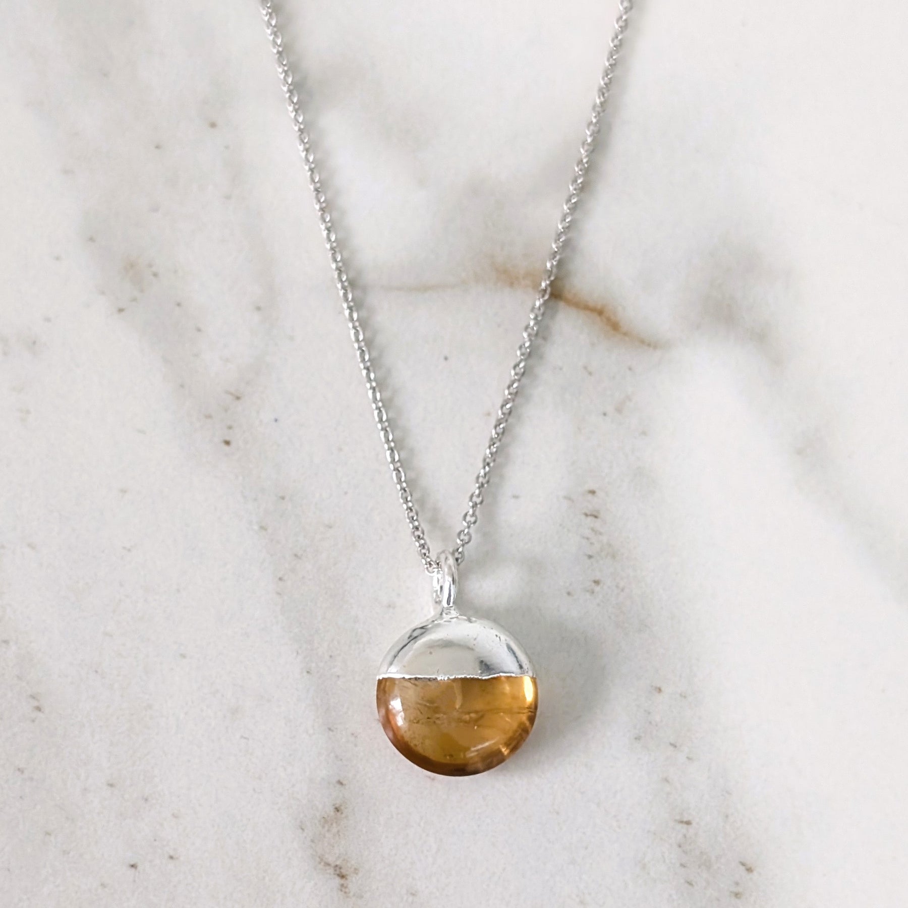 Radiating elegance and beauty, this stunning necklace comprises a circular citrine gemstone electroplated with sterling silver and suspended on a delicate cable chain.