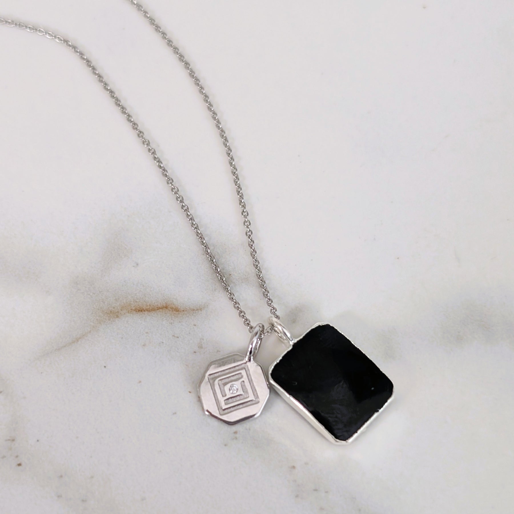 A beautiful Duo necklace comprising a sterling silver electroplated Black Onyx rectangular slice pendant teamed with an aquamarine tumblestone or charm of your choosing.