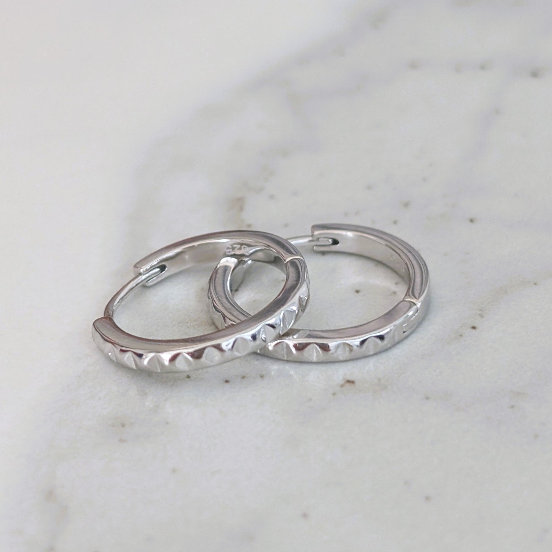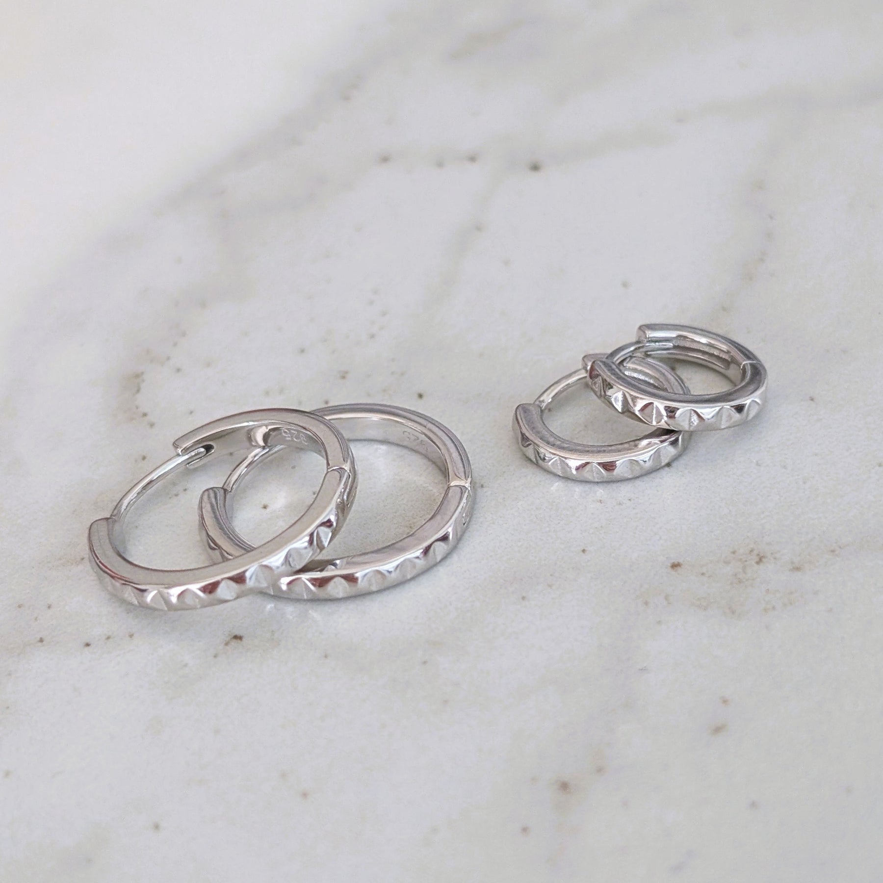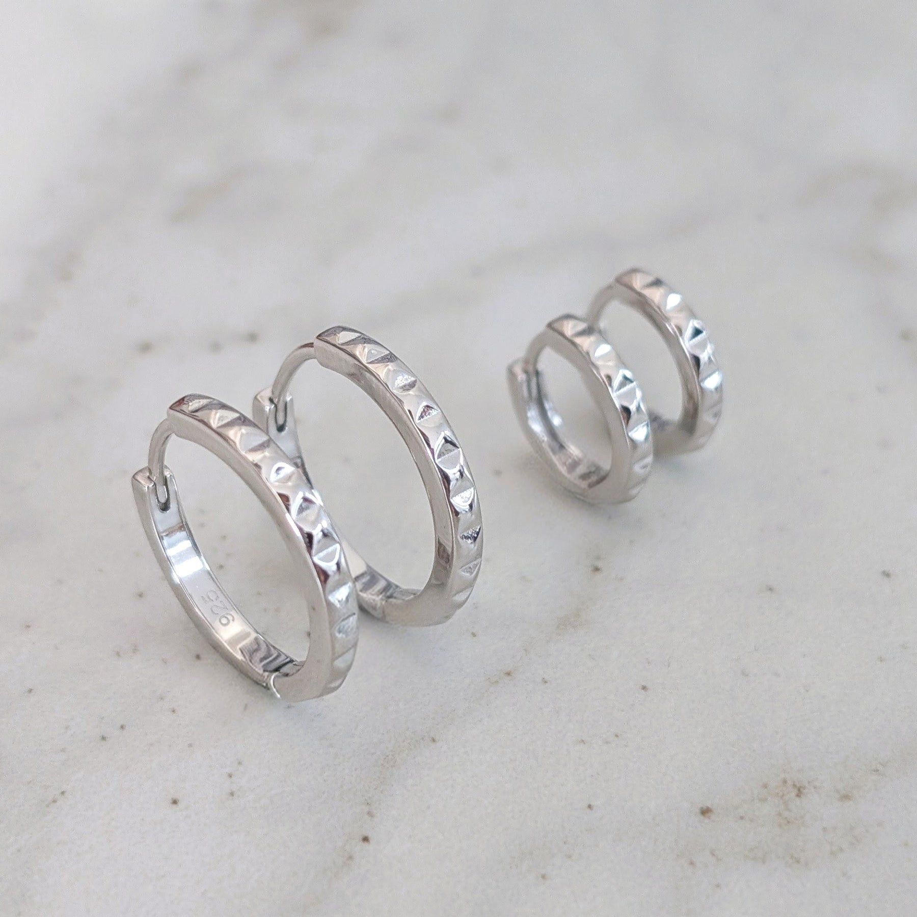 The pyramid hoop earrings comprise 925 recycled sterling silver (coated with a layer of white gold and an e-coating to impede tarnishing).