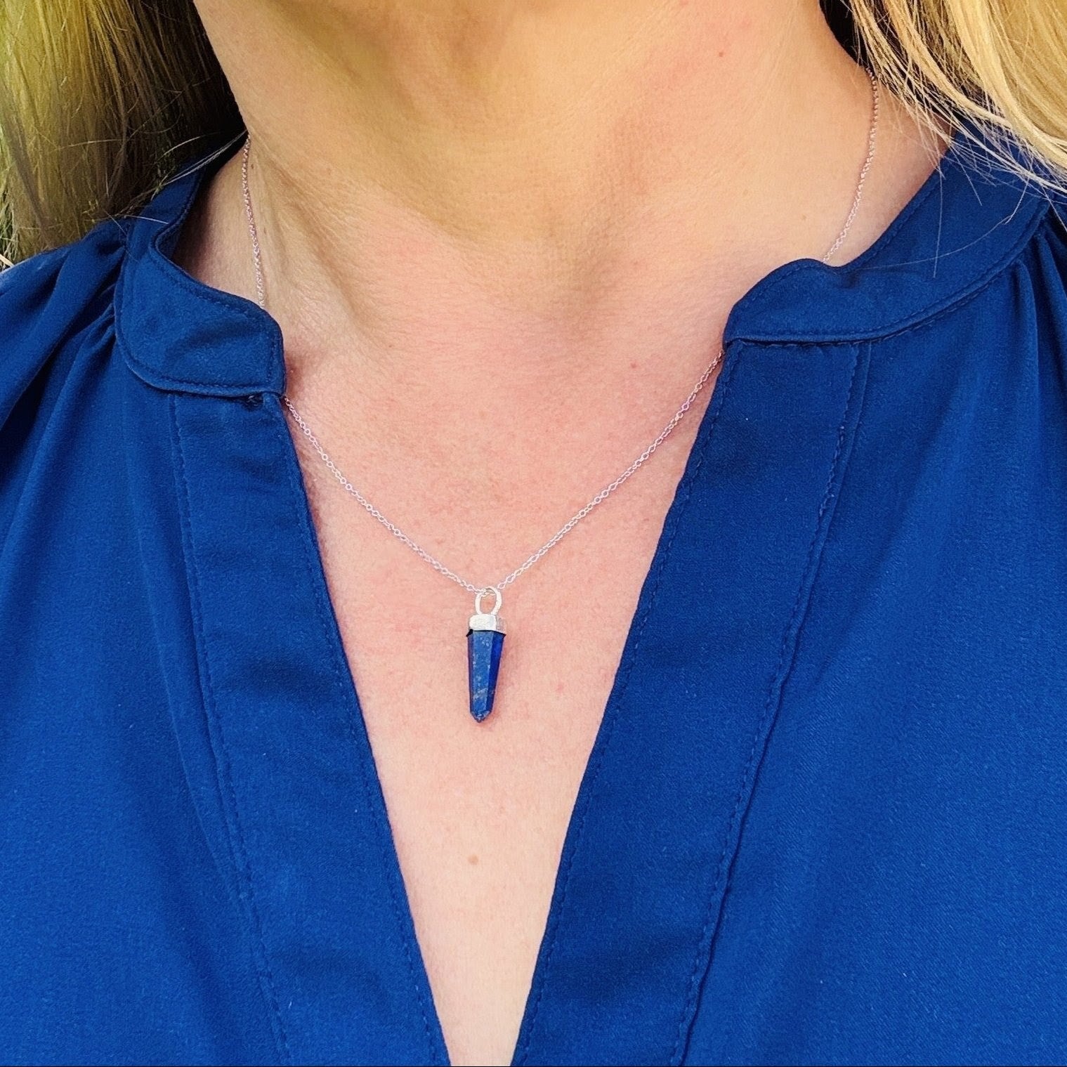 A stunning sterling silver Lapis Lazuli point pendant necklace. This necklace provides a subtle edge to any outfit.