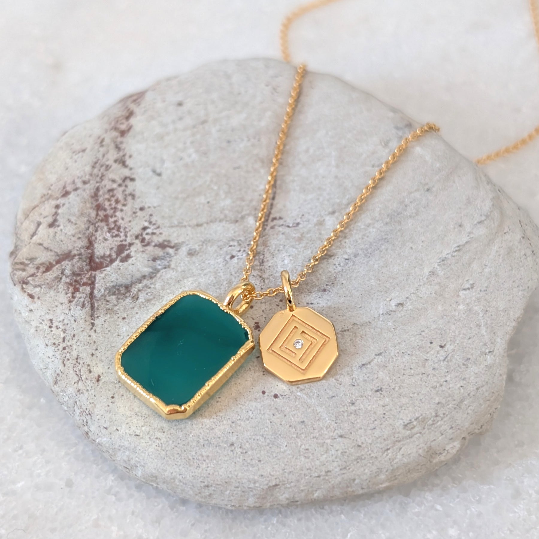 A beautiful Duo necklace comprising an 18 carat gold electroplated Green Onyx rectangular slice pendant teamed with an Citrine tumblestone or charm of your choosing.