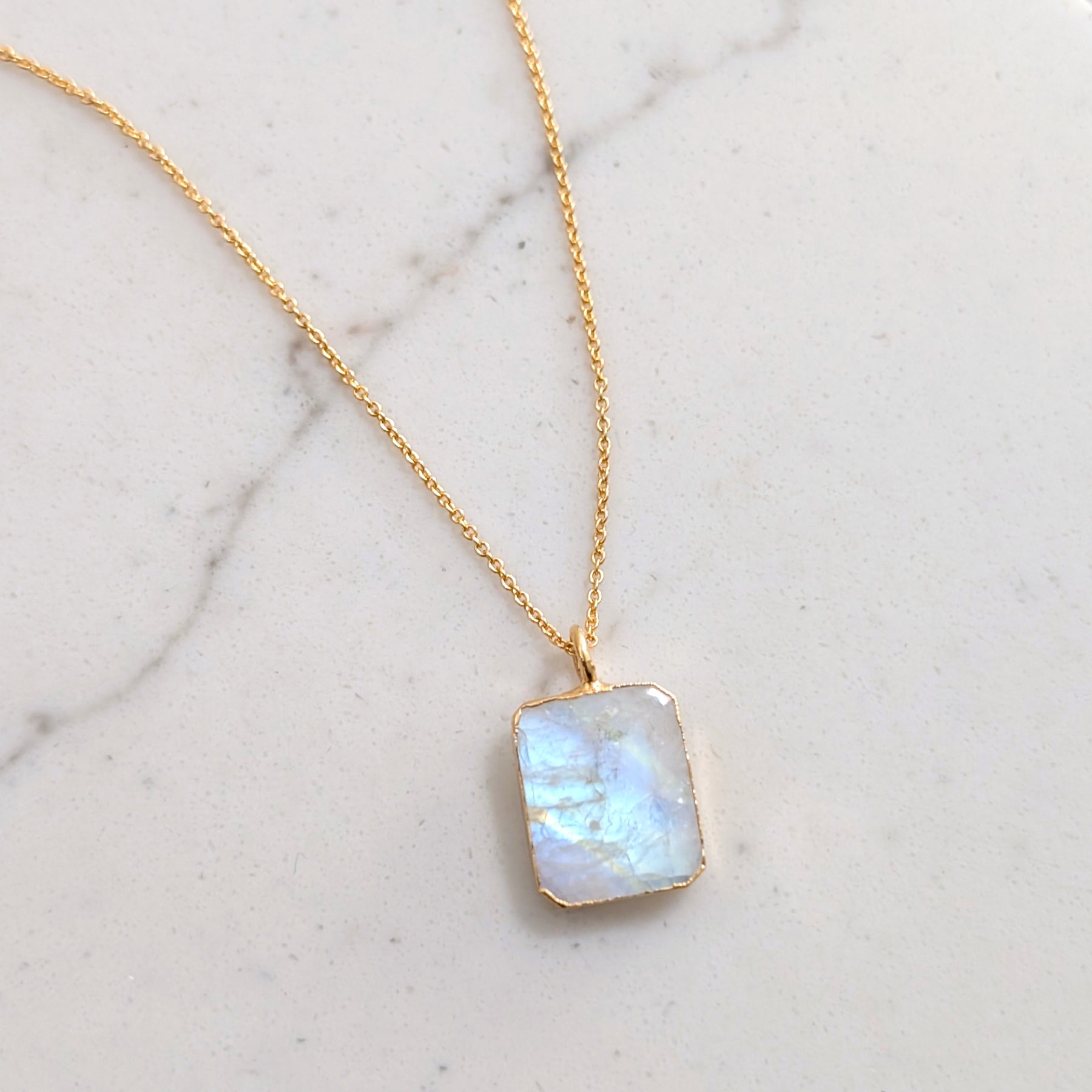 A beautiful 18 carat gold electroplated Moonstone rectangular slice pendant suspended on a cable chain.