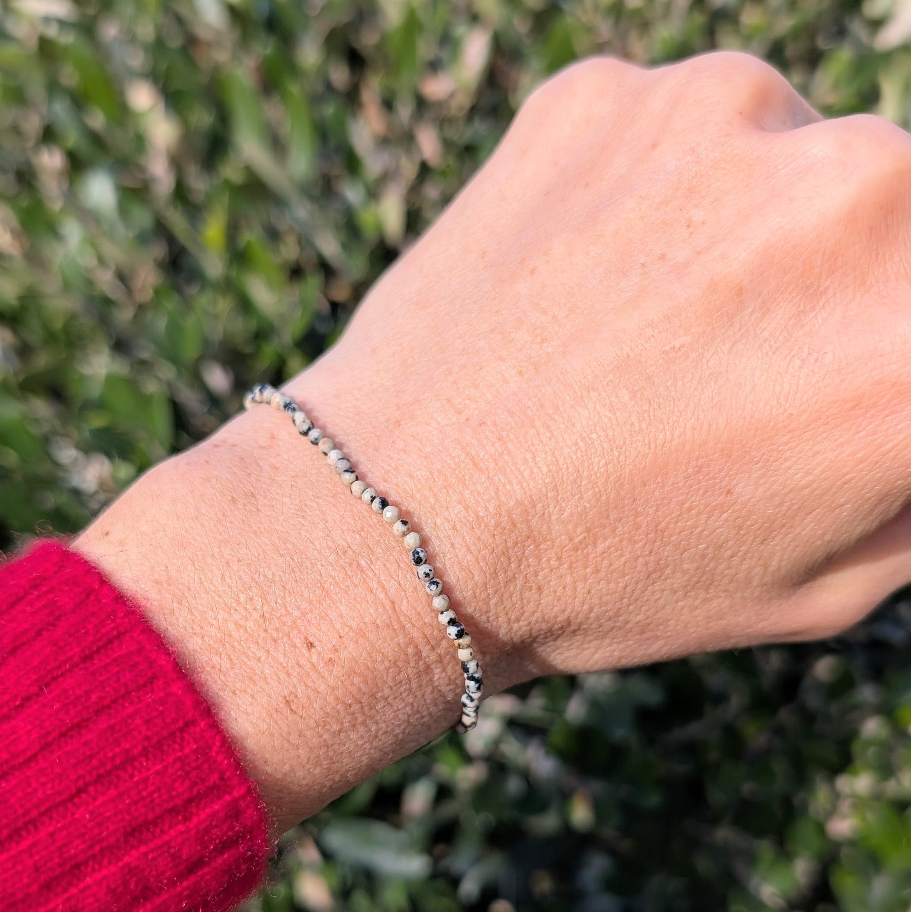 Elevate your style with our beautiful and dainty Dalmatian Jasper gemstone beaded bracelet comprising 2mm faceted gemstone beads, each exhibiting the stone’s distinctive black, brown and beige colour tones.