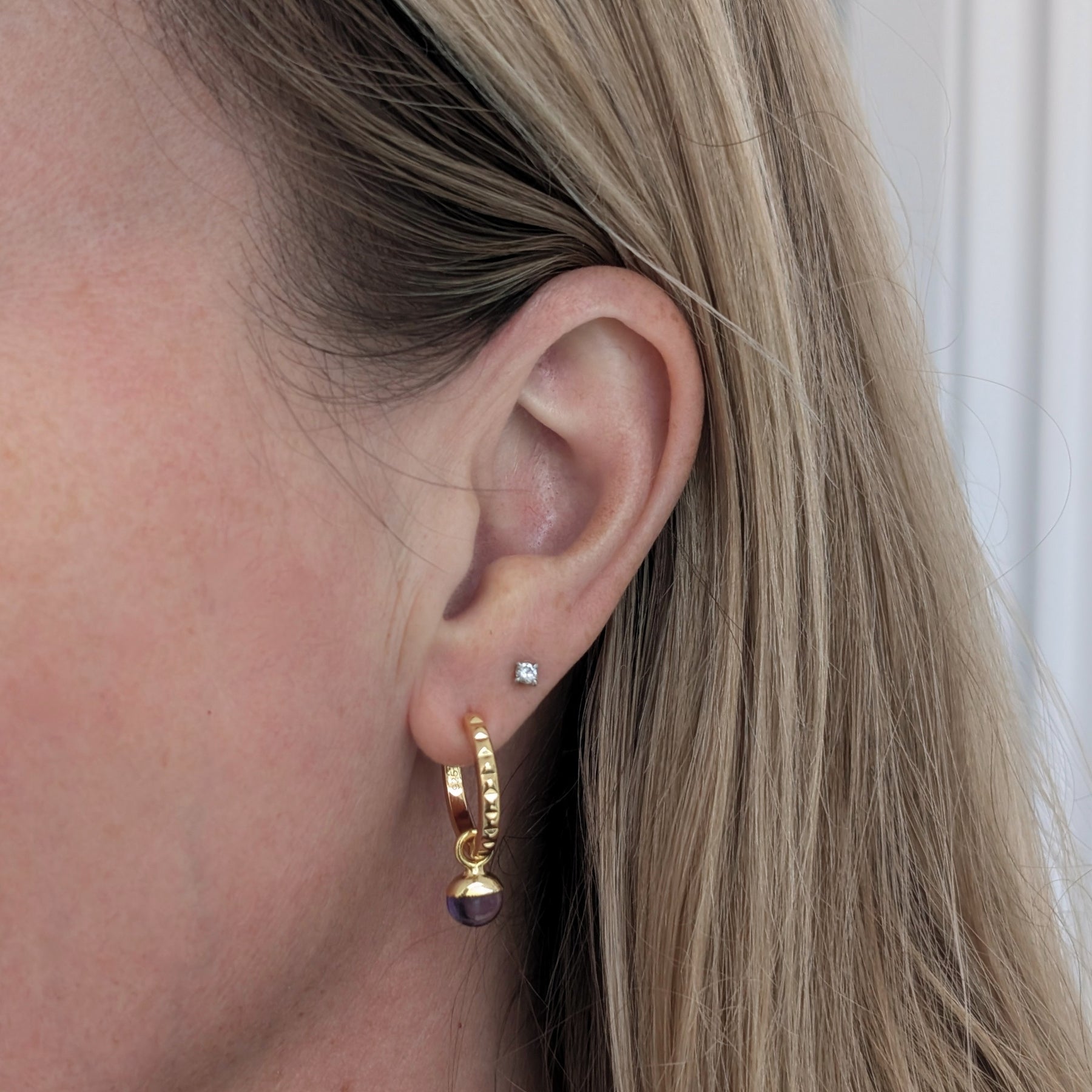 Radiating elegance and beauty, these stunning earrings comprise circular amethyst gemstone charms electroplated with 18 carat gold and suspended on delicate hoop earrings.